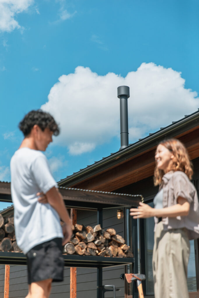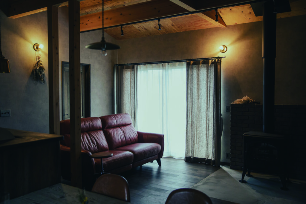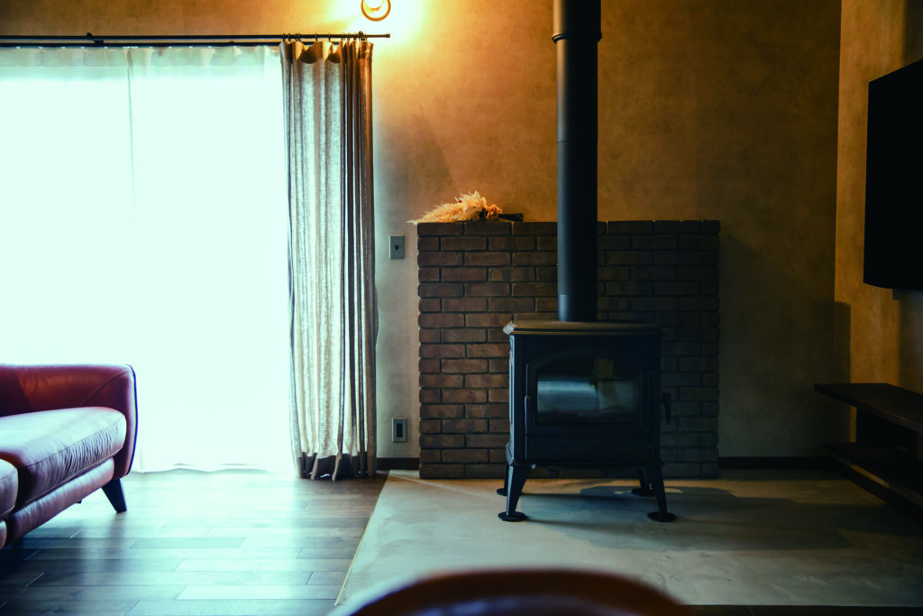 ◆リビングには存在感抜群の薪ストーブやレザーのソファがあり