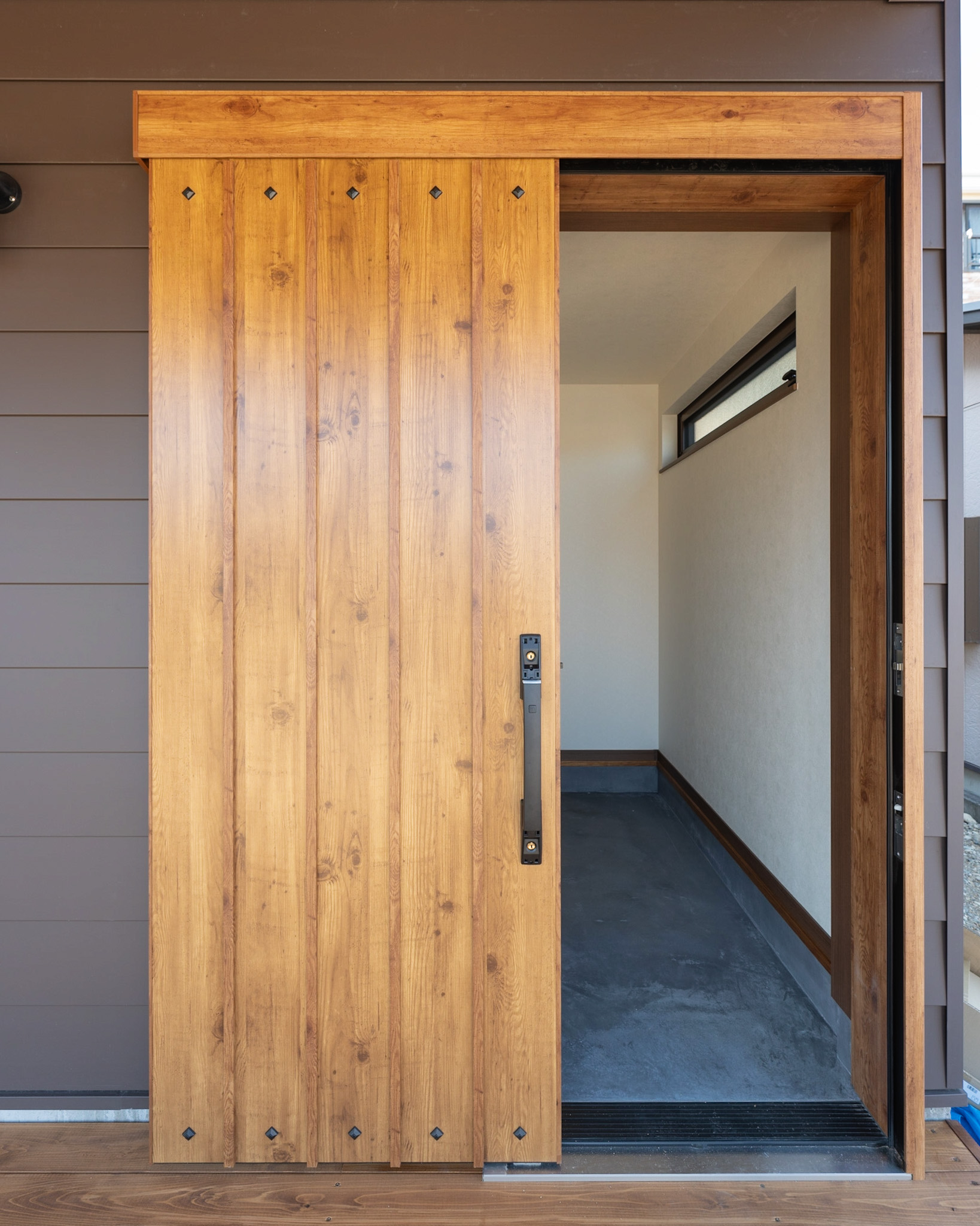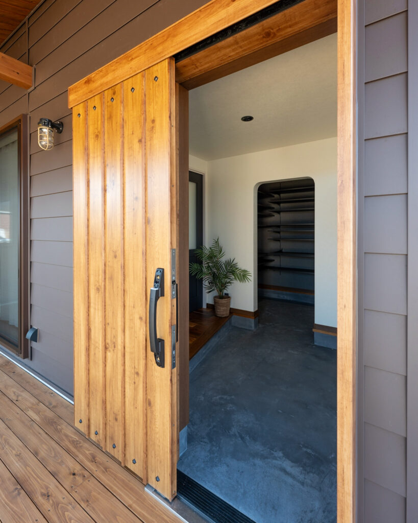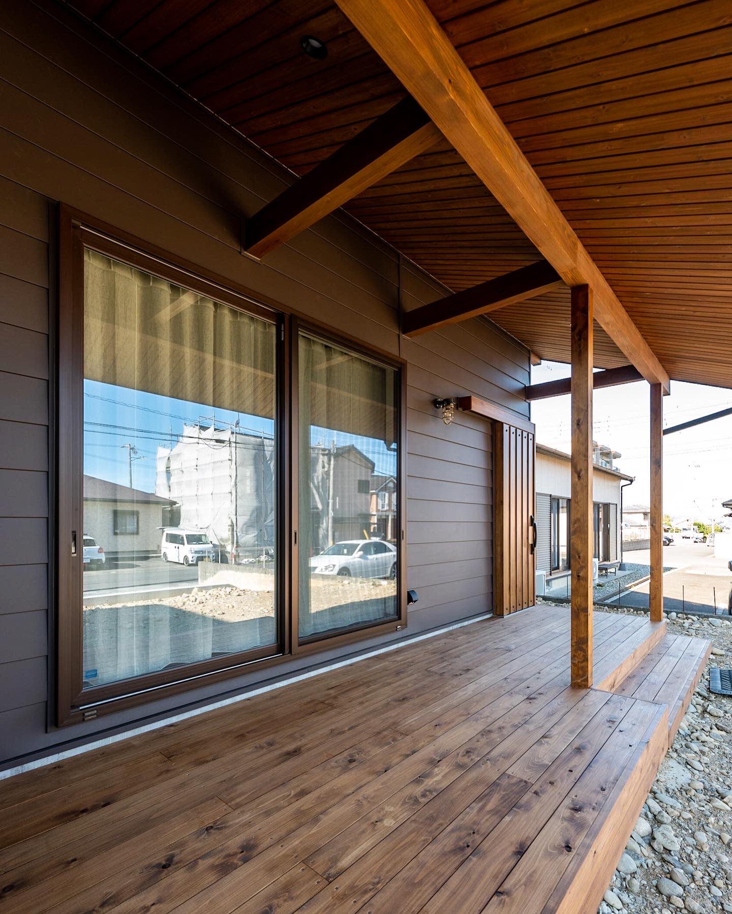 大開口サッシ&大きな屋根付きのウッドデッキがありアウトドアリビングとして利用可能。