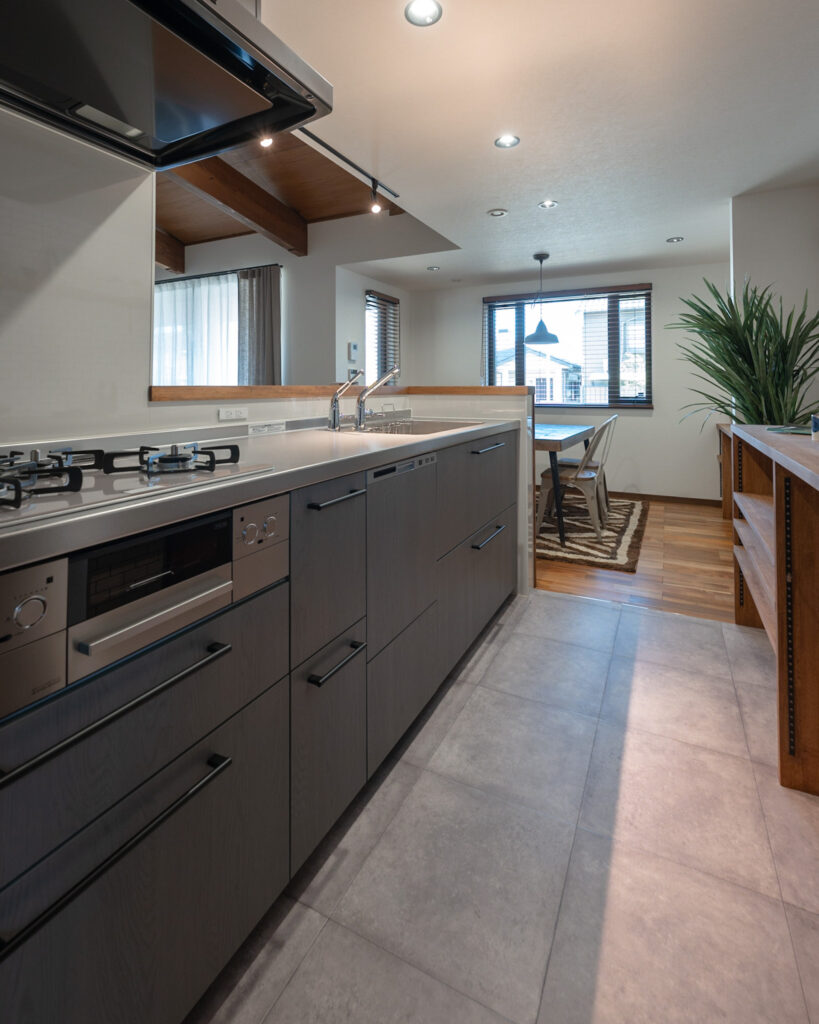 キッチンを中心とし、すぐ横には脱衣→お風呂の水回りを設置することで