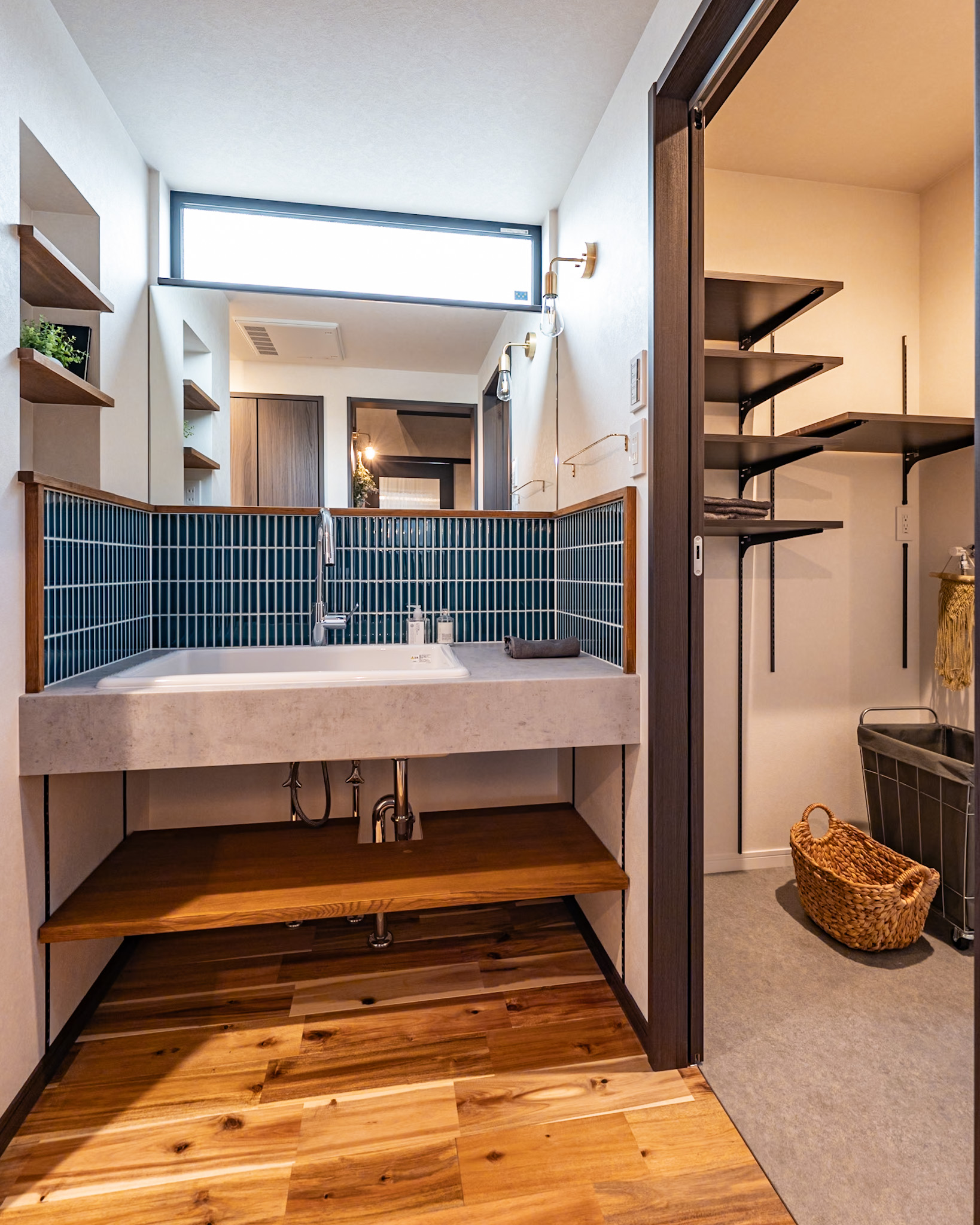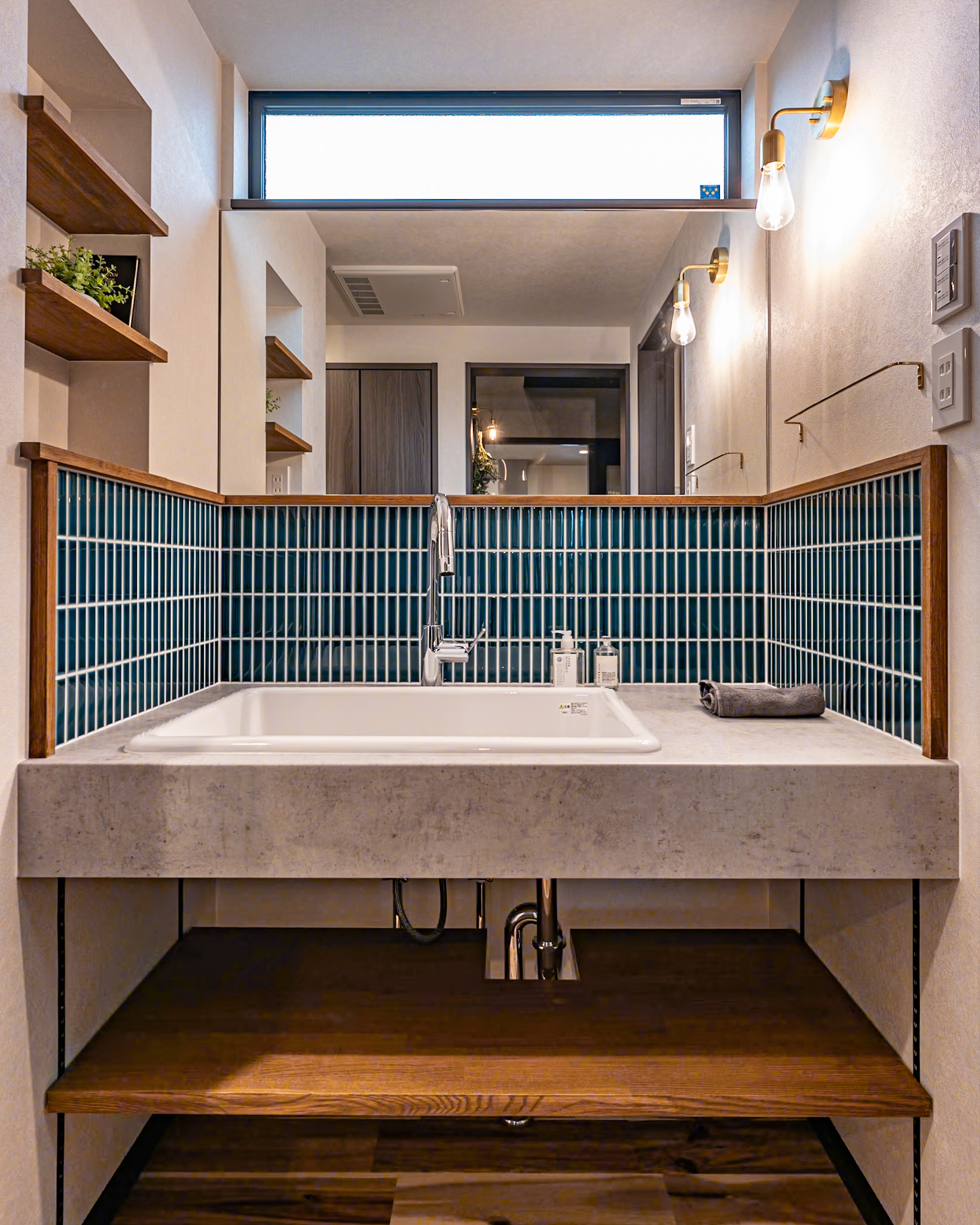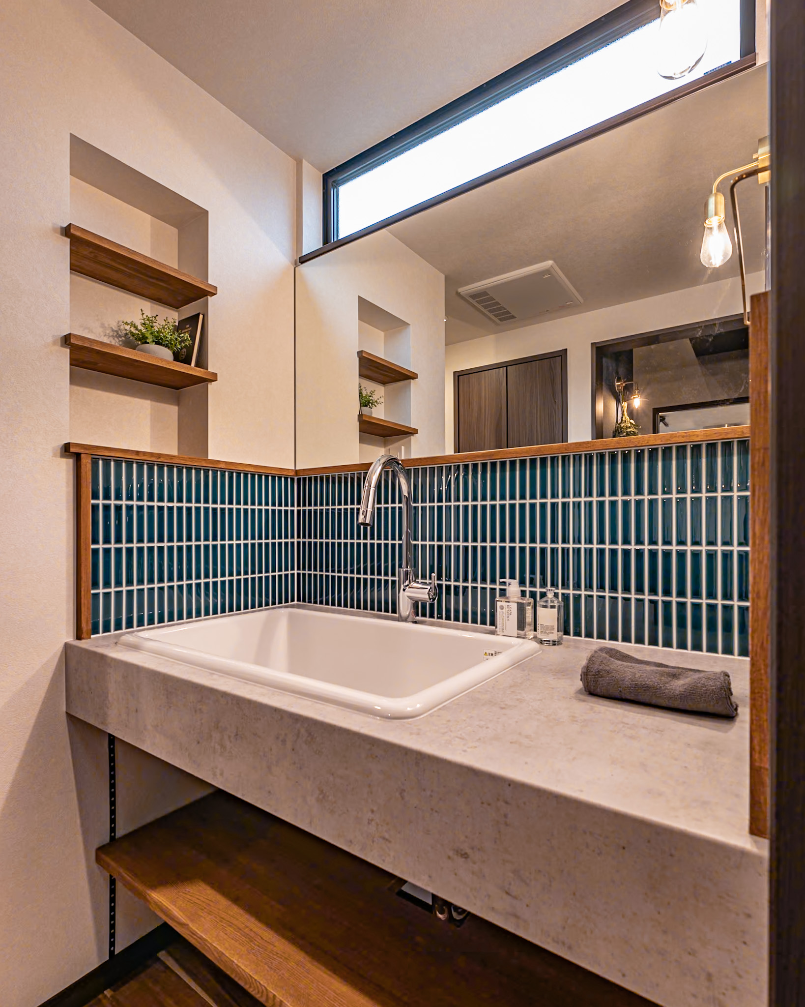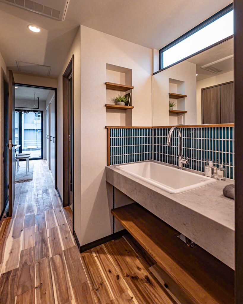 お手入れが楽なメラミンカウンターに濃グリーンタイルの造作洗面台✨