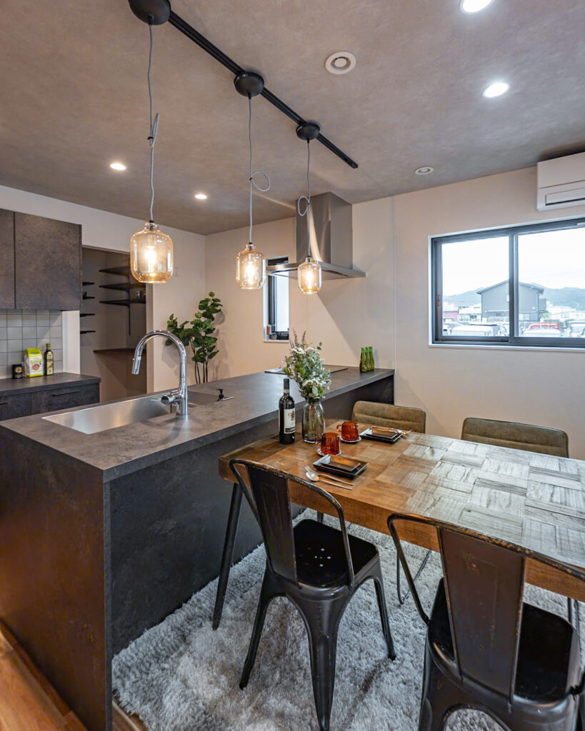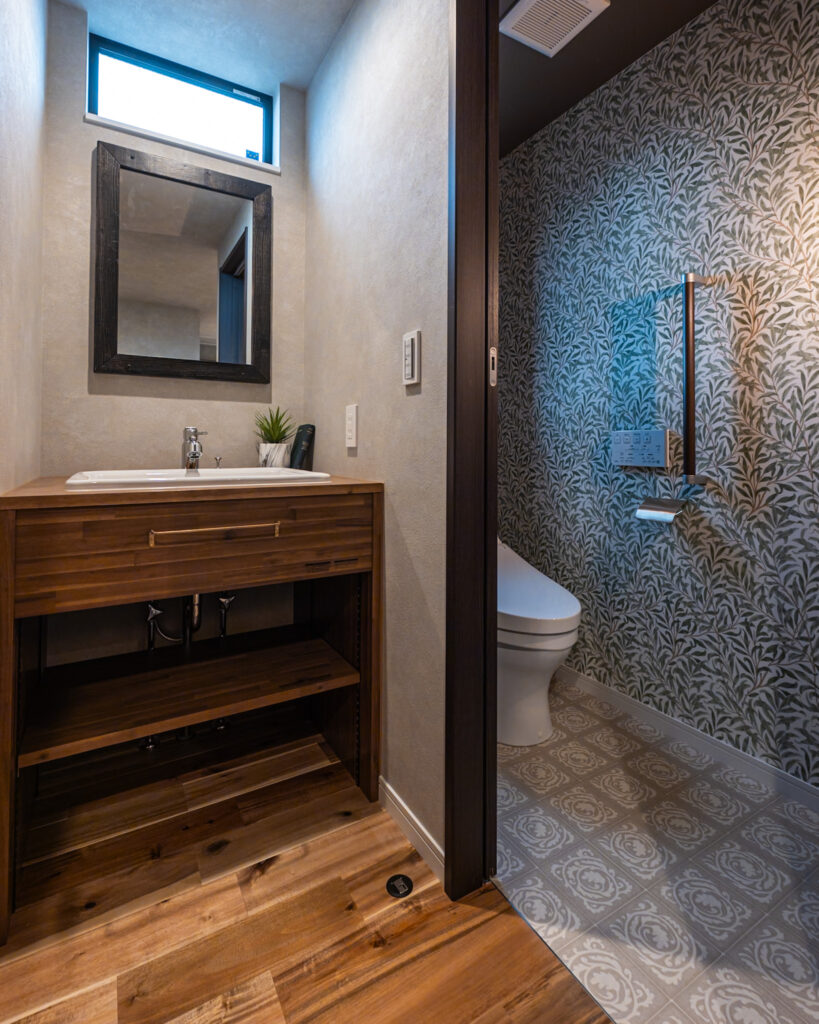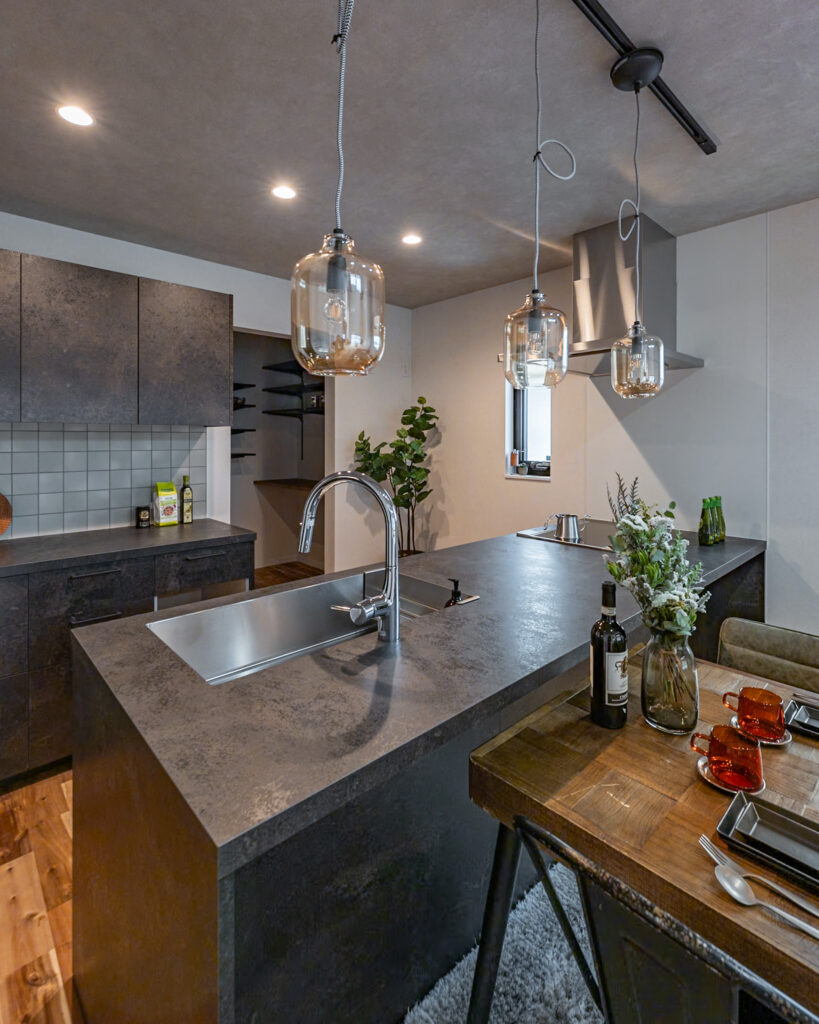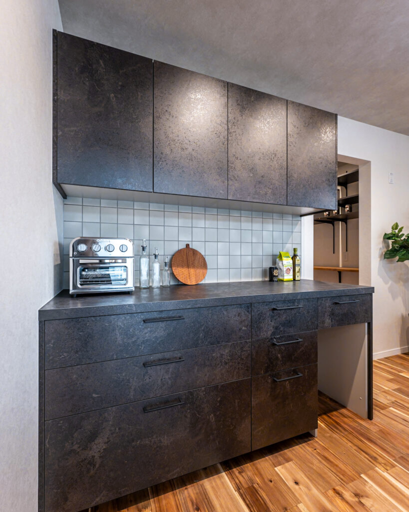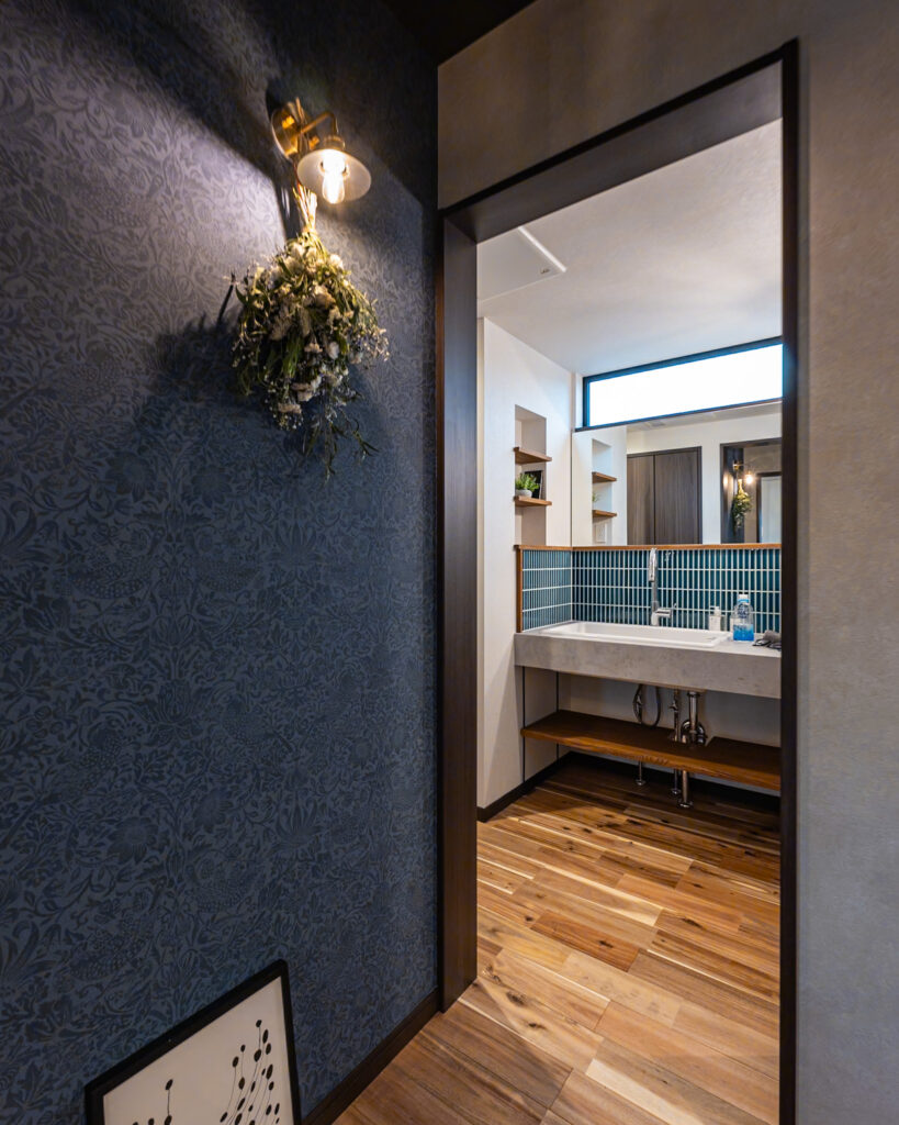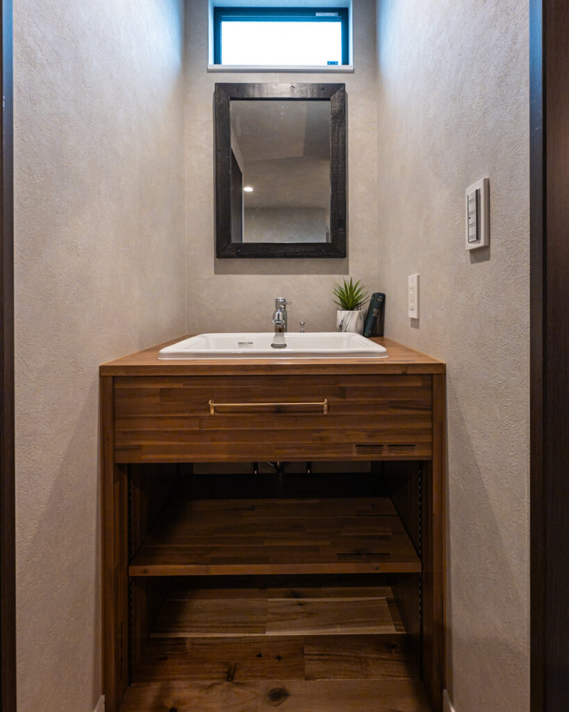 お手入れが楽なメラミンカウンターに濃グリーンタイルの造作洗面台✨